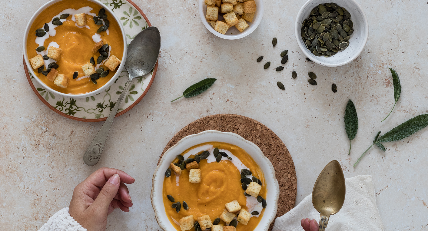 - Para servir, pode regar com um fio de leite de coco, sementes de abóbora e croutons caso pretenda.